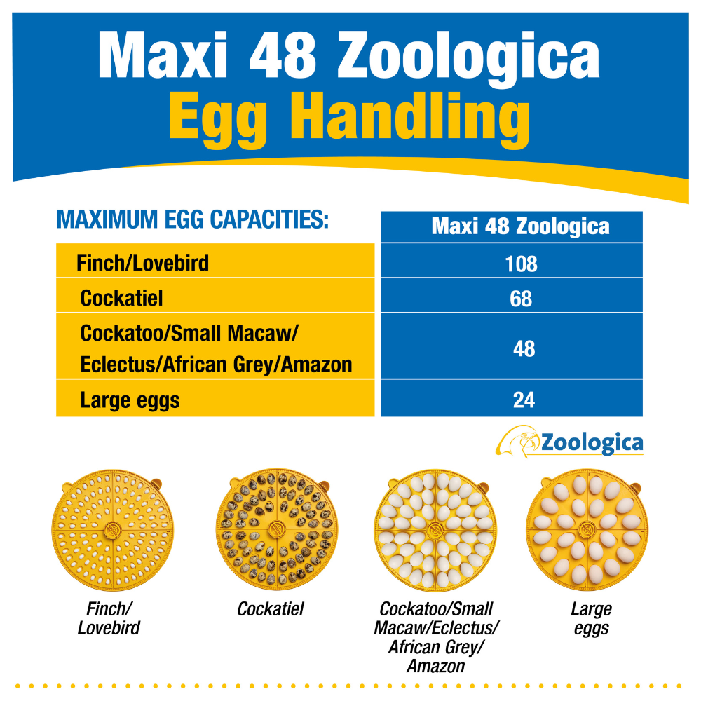 The Brinsea Maxi 48 Zoologica is specifically designed to provide optimum conditions for hatching parrot and other exotic species. Based on the popular Maxi 48 EX, Brinsea worked closely with parrot breeding experts to improve key features of the Zoologica model to suit exotic birds' eggs. Many of these eggs are tiny and fragile, so Brinsea introduced a new egg quadrant accommodating 108 of the smallest size eggs in the incubator. The egg turning is slowed and incorporates soft-start to provide the gentlest turning. The control software has also been updated to improve the user experience. The highly accurate control of humidity and temperature, along with reliability and great visibility, make the Maxi 48 Zoologica the perfect parrot and exotic egg incubator.
